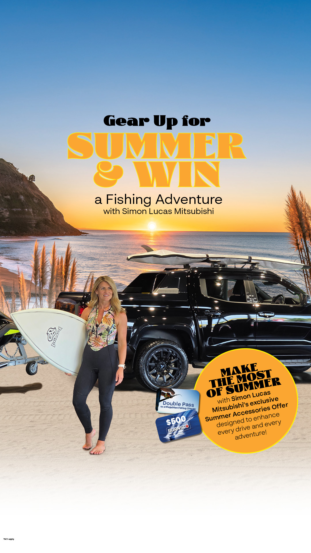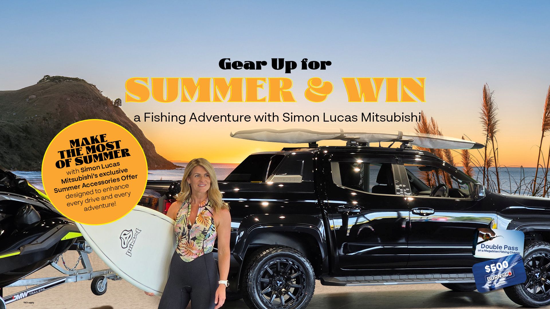 Purchase any genuine Mitsubishi accessory package valued at $1,000 or more, and you’ll go in the draw to win a Double Pass on a Megabites Fishing Charter plus a $500 Burnsco voucher to gear up for the ultimate day on the water. Total prize value: $1,000.